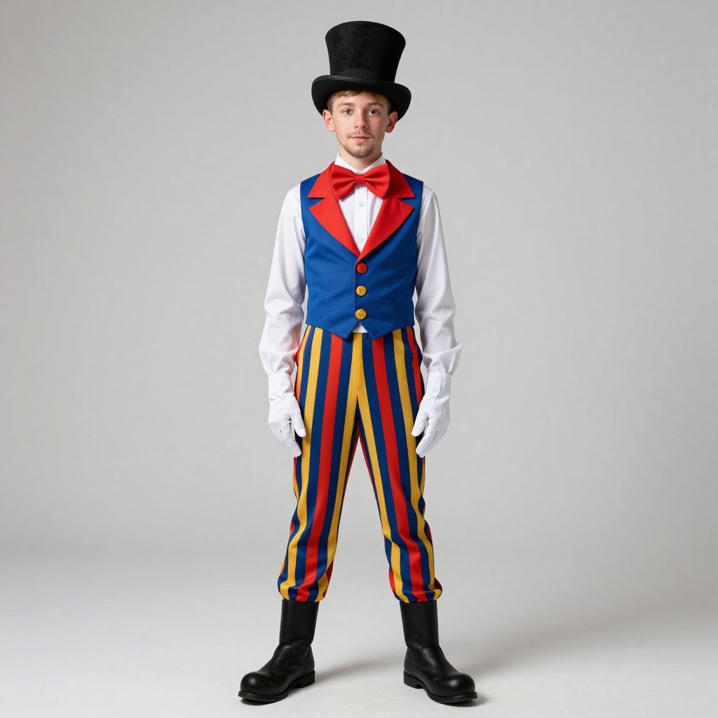 Circus costume man, 1boy, solo, male focus, hat, top hat, striped pants, striped clothes, pants, vest, bowtie, standing, bow, full body, vertical-striped clothes, gloves, clown, facial hair, boots, white gloves, red bow, black footwear, red bowtie