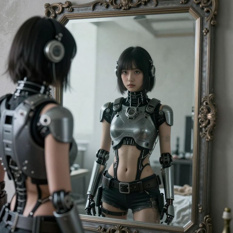 Biopunk the image of a large, heavy mirror. I look straight into the mirror, and this is what i see: myself, normally very cute girl, but today Ive turned into an androide,