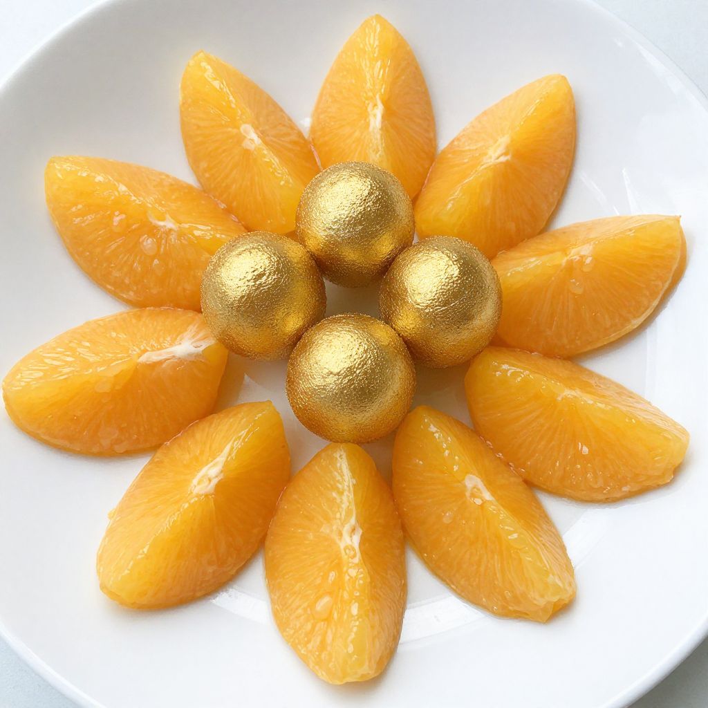 Golden mandarin slices arranged in a circular pattern around three textured, golden-colored dessert balls, presented elegantly on a white plate, showcasing a delightful blend of fresh fruit and sweet treats.
