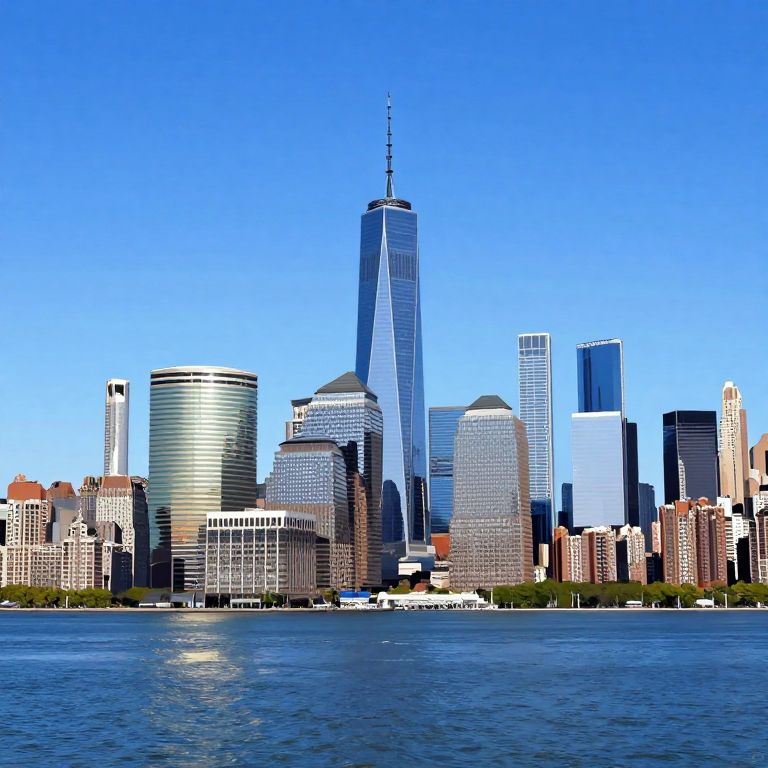 This is a digital drawing of a city skyline viewed from across a body of water. The skyline is dominated by a tall, blue-tinted skyscraper in the center. Surrounding buildings are various heights and colors, including shades of brown, gray, and white. The water in the foreground is a deep blue, and the sky above is bright with a gradient from light to dark blue.