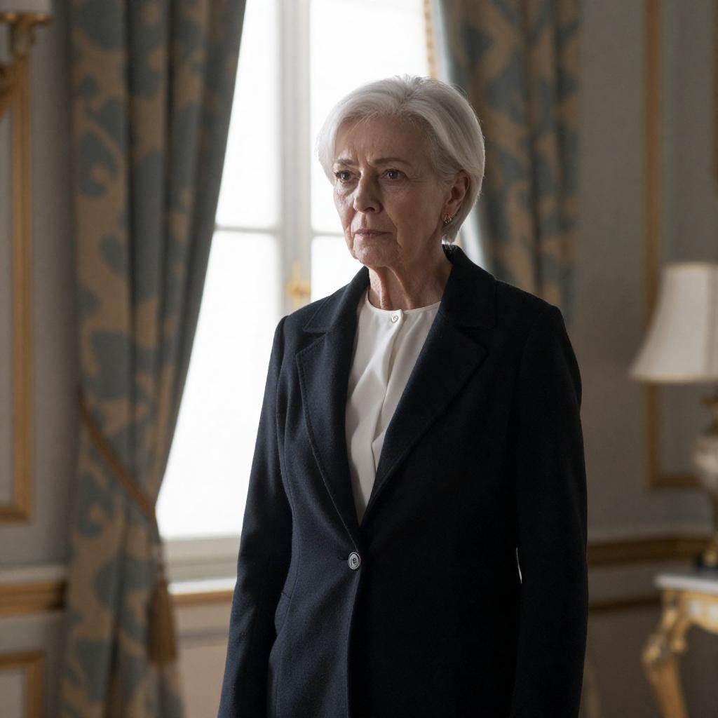 Photograph of a middle-aged woman with short, white hair, wearing a black coat over a white blouse, standing in an ornately decorated room with patterned curtains and a bright window behind her. She looks slightly to the left with a serious expression. A lamp is visible in the background.