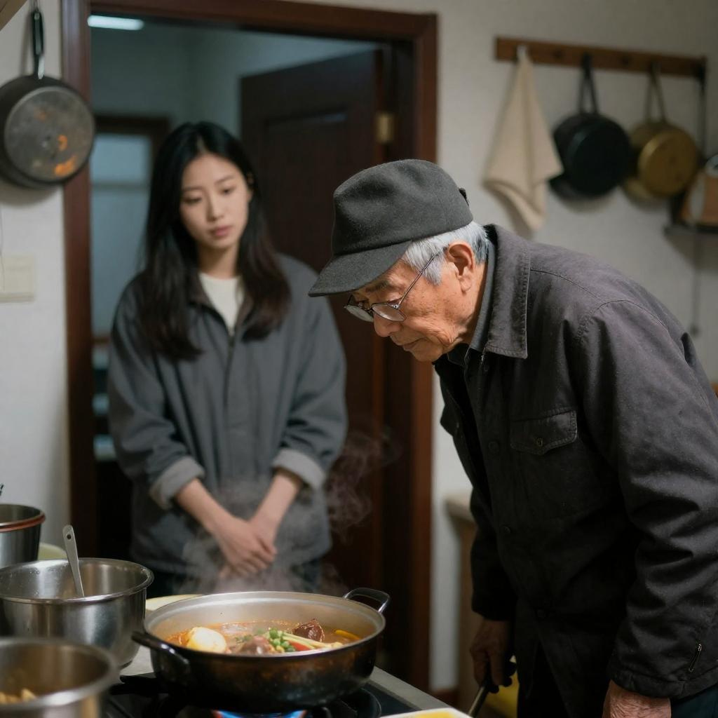 Old man with gray hair, glasses, and dark hat bends over pot of food in kitchen. Young woman with long dark hair and gray jacket stands in doorway, hands clasped. Hanging pots and towels in background. Dim lighting.