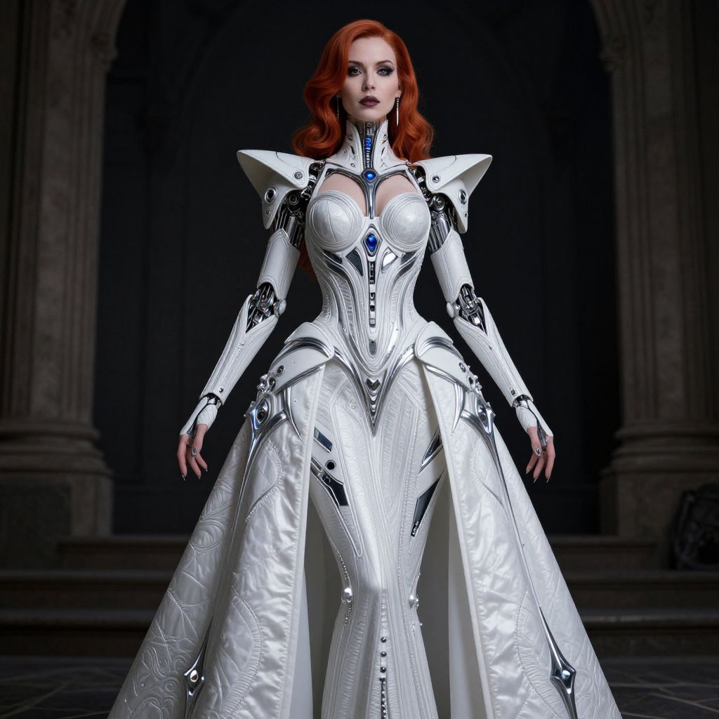 Photograph of a striking red-haired woman in a futuristic, white, armored gown with intricate silver detailing and blue accents. Her dress features high, angular shoulder pads, a fitted bodice with a prominent blue gem at the center, and a voluminous, textured skirt. She stands confidently in a dimly lit, grand architectural setting with tall, dark pillars in the background. Her wavy hair falls to her shoulders, and her makeup is bold, enhancing her dramatic appearance. The gown's material is shiny and metallic, adding to the sci-fi aesthetic.