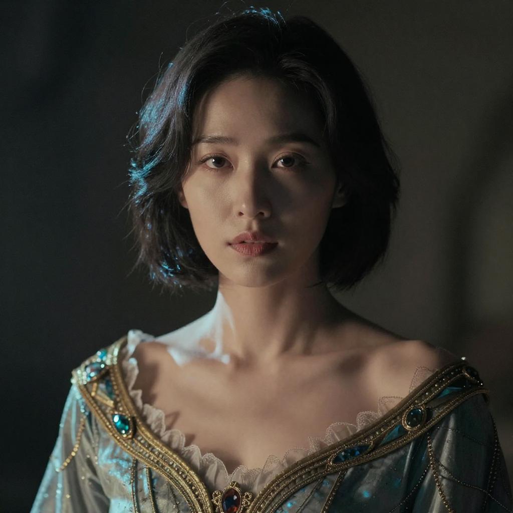 Photograph of a woman with short, curly black hair and fair skin, wearing a pink, short-sleeved top with a square neckline. She has dark, arched eyebrows, subtle eye makeup, and red lipstick. She gazes slightly to the right with a neutral expression. The background is blurred, featuring muted brown and gray tones.