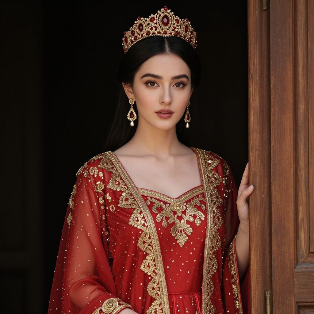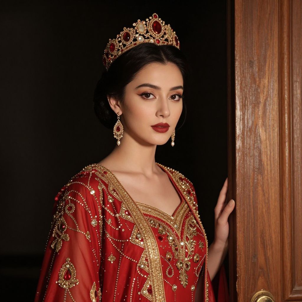Elegant portrait of a woman adorned in a richly detailed red gown with gold embellishments, featuring a matching tiara and dangling earrings, set against a dark background with a partially open wooden door to the right.