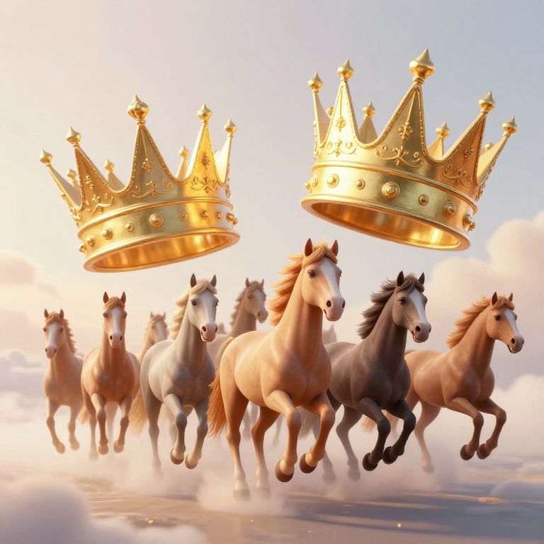 Digital artwork of galloping horses with golden crowns floating above them, set against a radiant, cloudy sky backdrop.