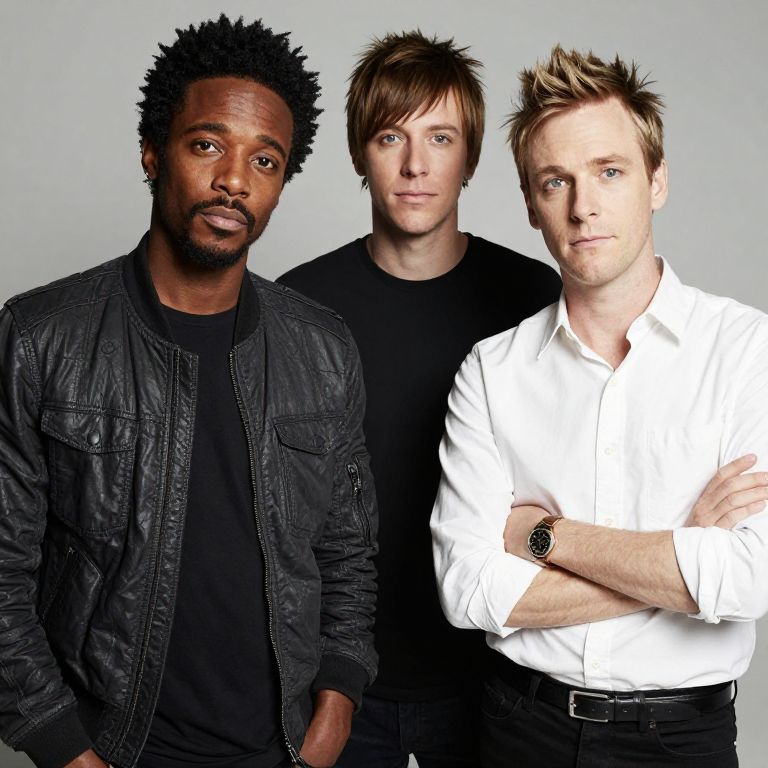 Photograph of three men standing closely together against a plain light gray background. The man on the left is Black with dark skin, short curly hair, and a black leather jacket over a black shirt, looking slightly to the right. The middle man has light skin, brown hair, and is wearing a plain black t-shirt, looking straight ahead. The man on the right is also light-skinned with blonde hair, wearing a white button-up shirt, and a black belt; he has his arms crossed and looks directly at the camera. All three have serious expressions.