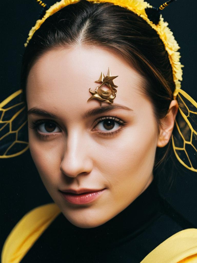 Woman in Bee Dance Costume, close-up detailed headshot with bee antennae