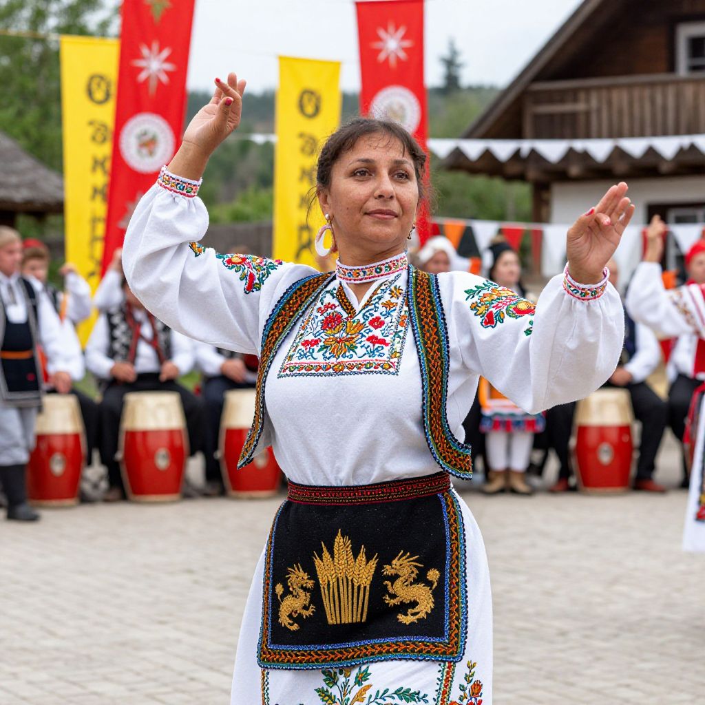 Photograph of a middle-aged woman in traditional white and black embroidered folk dress, arms raised, standing in front of a colorful festival backdrop with drummers