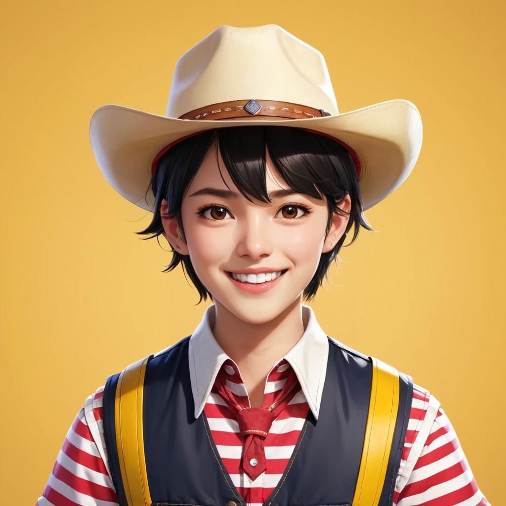 Solo, smile, hat, shirt, black hair, short hair, brown eyes, looking at viewer, 1girl, yellow shirt, brown headwear, collared shirt, grin, simple background, portrait, cowboy hat, ascot, vest, upper body, striped shirt, teeth, 1boy, overalls, red ascot, striped clothes