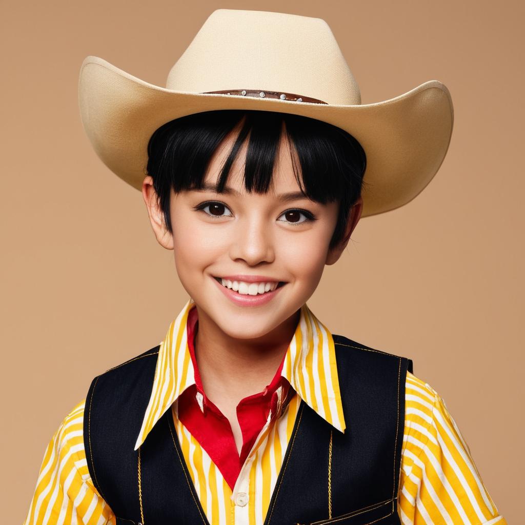 Close-up portrait of a young woman wearing a red cowboy hat, a yellow striped shirt, and a dark denim vest, smiling against a plain beige background.
