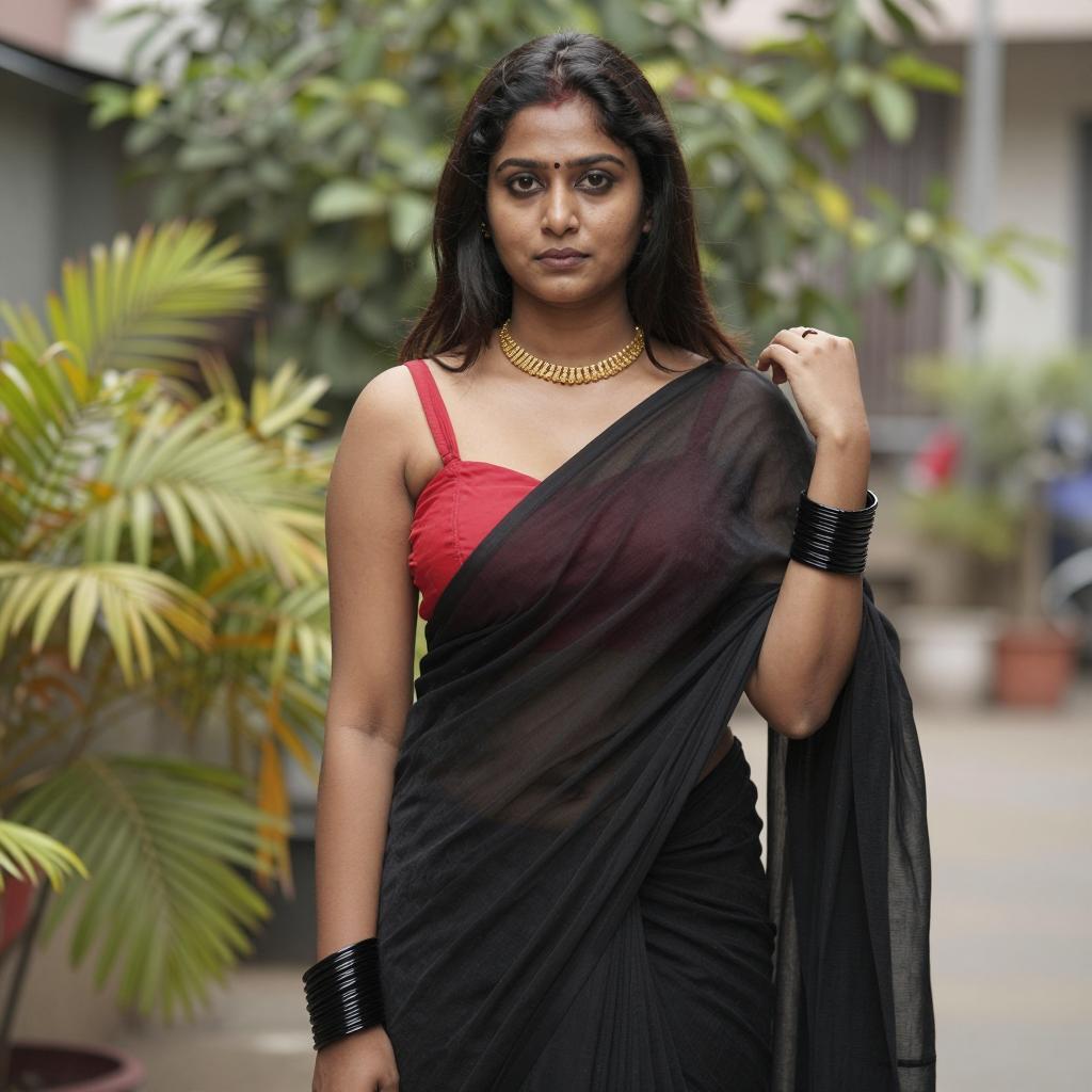 Woman sarees costume, photograph of an Indian woman standing outdoors, wearing a yellow and orange traditional saree, long dark hair, red bindi, red lipstick, gold earrings, red bangle, serious expression, sunlight filtering through trees in the background, green grass, bokeh effect, natural light, daytime, traditional Indian attire, cultural, portrait shot, medium shot, casual pose, soft focus background