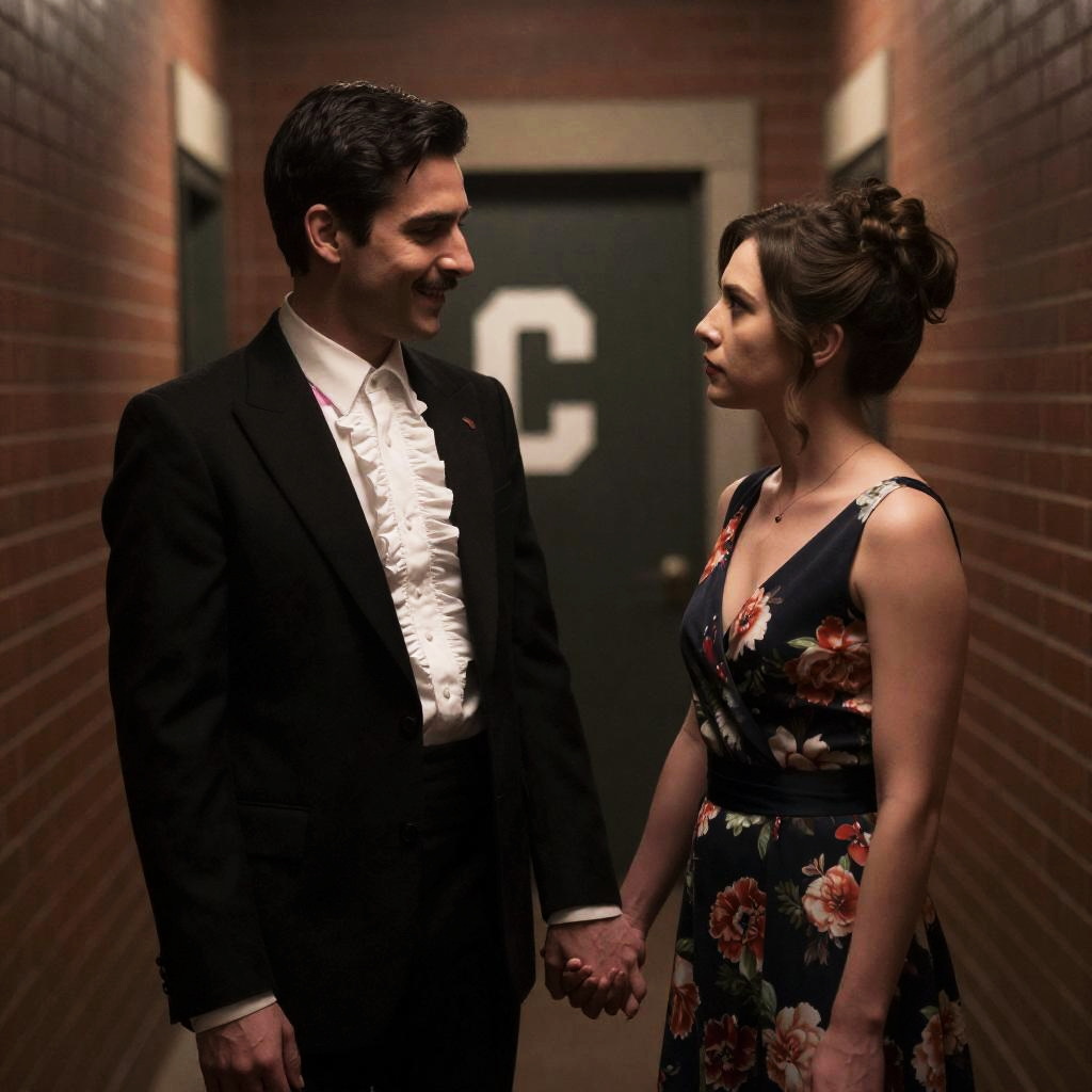 Photograph of a man and woman standing indoors. Woman with curly brown hair, wearing a purple and green striped dress with floral embellishments, looks slightly down. Man with brown hair, mustache, wearing a black tuxedo with a white ruffled shirt, smiles. Background includes a brick wall and Christmas decorations.