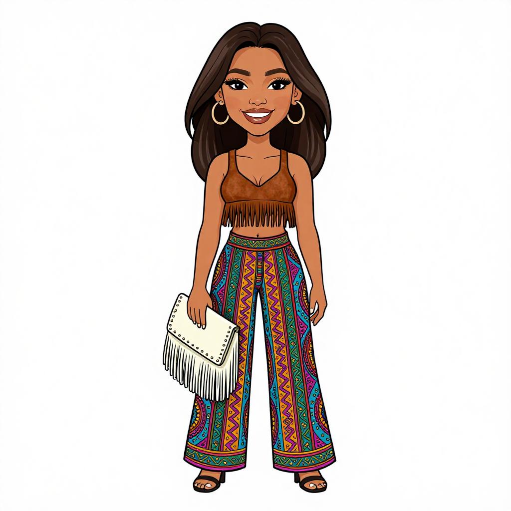 Woman with pretty face and pretty hair. smiling Woman, trendy fashion, black sleeveless v-neck crop top, high-waisted wide-leg trousers with snakeskin print, open-toe black heels, black clutch with fringe detail. --sref 1467