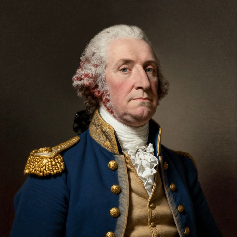 A digital portrait of George Washington in a blue coat with gold detailing, featuring a white cravat and a dark, textured background.
