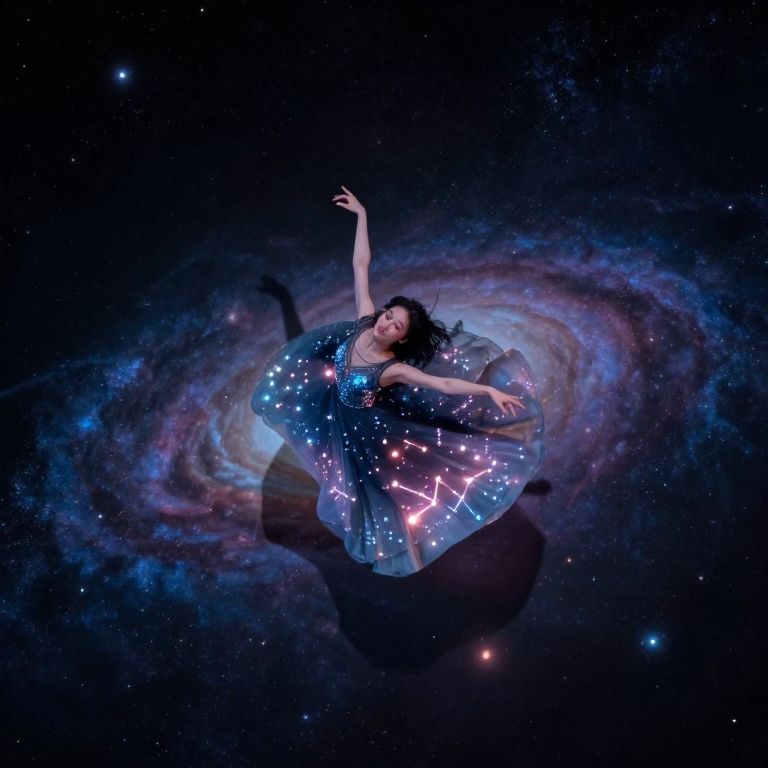 A mesmerizing, dreamlike scene featuring a celestial dancer gracefully levitating amidst floating galaxies. The dancer wears an ethereal gown adorned with shimmering constellations that softly illuminate her enigmatic expression. From an aerial perspective above the cosmic stage, capture the breathtaking dance of light and shadows cast upon the nebulous background, evoking feelings of awe and wonder while maintaining a sense of tranquility and introspection in this celestial ballet.
