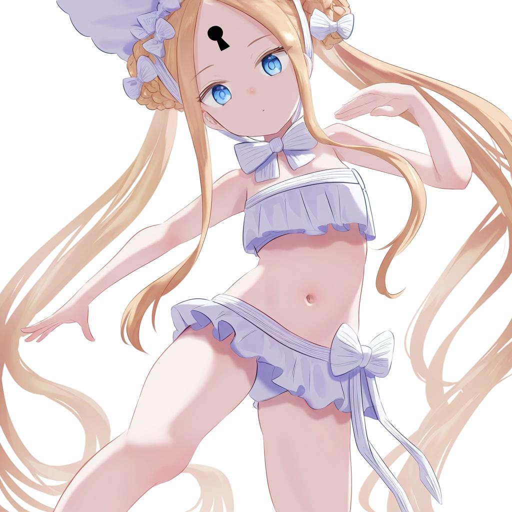 Abigail williams (swimsuit foreigner) (fate), fate (series), 1girl, blue eyes, very long hair, blonde hair, parted bangs, sidelocks, twintails, double bun, hair bow, small breasts, thighs, navel, white headwear, white bikini, bare shoulders, white bow, forehead, bonnet, keyhole, miniskirt, by artist uenoryoma, leet
