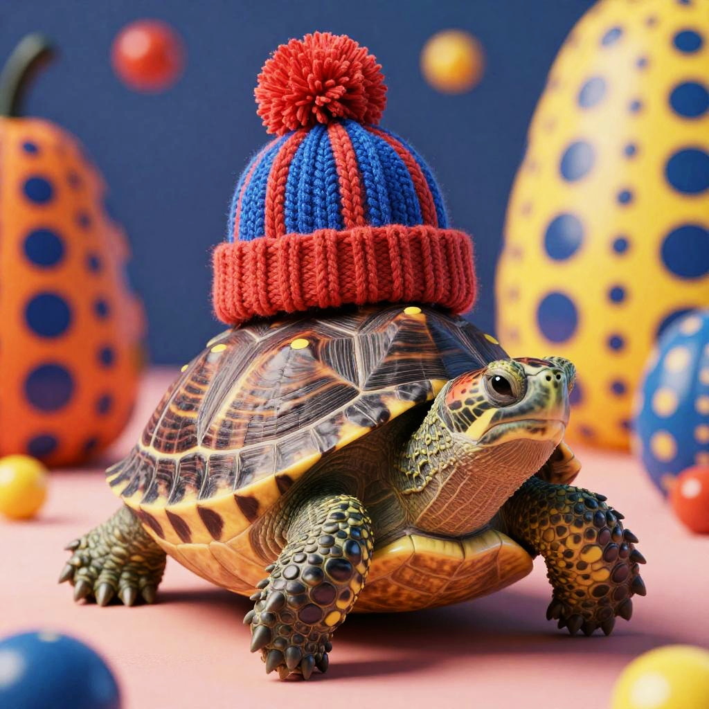 Close-up realistic photo of a turtle with an intricately patterned shell adorned with yellow dots, wearing a cozy knitted beanie in blue and red with a pom-pom on top. The background features colorful, polka-dotted objects inspired by Yayoi Kusama's artistic style, emphasizing vibrant patterns and bright colors.