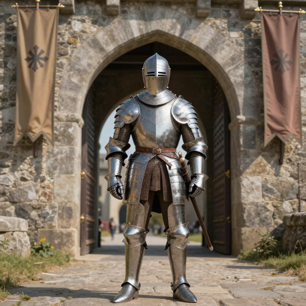 Noble pose of a regal warrior standing tall on a castle balcony, intricate medieval armor shimmering under golden sunlight, detailed background of ancient stone walls and fluttering banners, epic and majestic atmosphere, ultra-realistic style