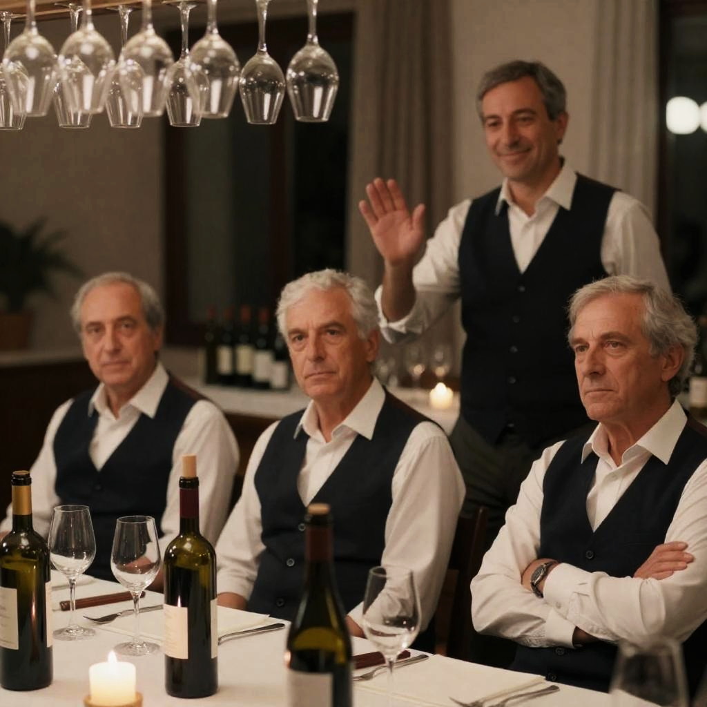 Photograph of four older men in a wine tasting room. Three seated men in dark vests and white shirts, one standing with hand raised. Glass wine bottles, glasses, and a candle on the table. Background: hanging wine glasses and curtains. Seated men have intense, focused expressions. Standing man smiles. Warm lighting. Reflections in mirror.