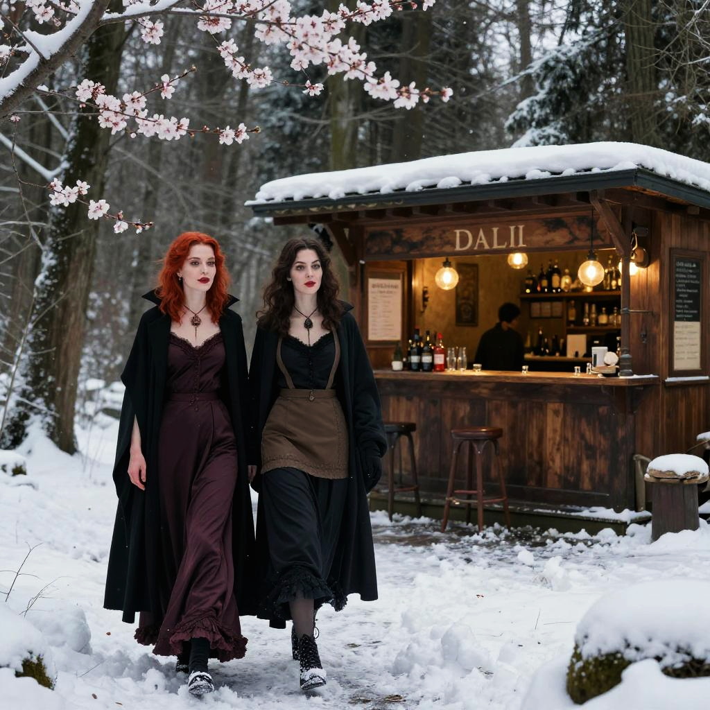 Realistic photo of two women dressed in vintage gothic-inspired clothing walking through a snowy forest with blooming cherry blossoms overhead. One woman has red hair wearing a dark purple dress with a black cape, and the other has dark brown hair wearing black and brown layered garments with a cape. They walk past a rustic wooden bar named 'DALI,' softly lit and stocked with various bottles inside. The winter setting is quiet and atmospheric with snow-covered ground and trees.