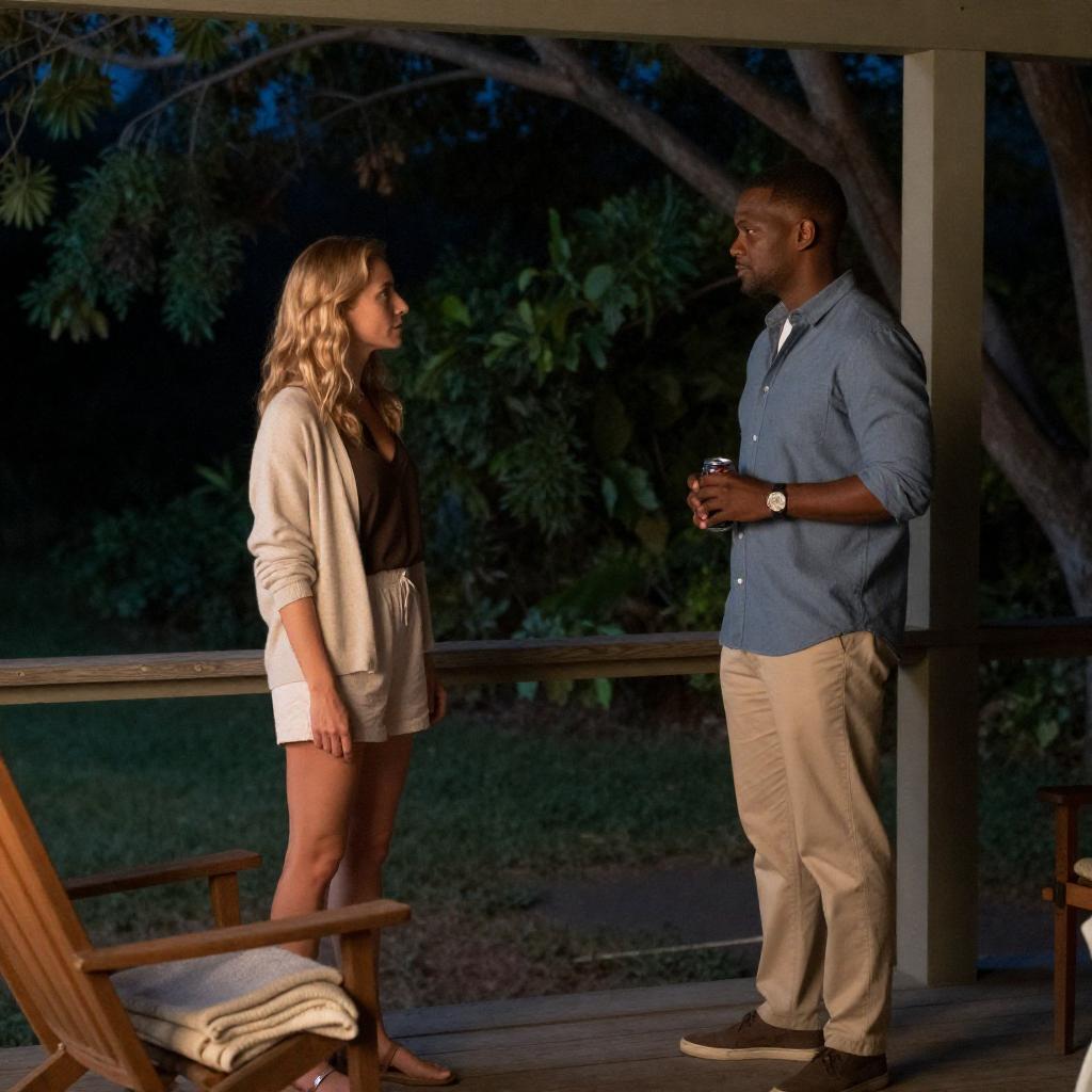 Photograph of two people on a wooden porch at night. Blonde woman in beige cardigan, brown top, and shorts, standing left. Black man in blue shirt, beige pants, standing right, holding a soda can. Lush green foliage background. Wooden chair with folded blanket in foreground. Woman looking at man, man looking down. Tree branches overhead.
