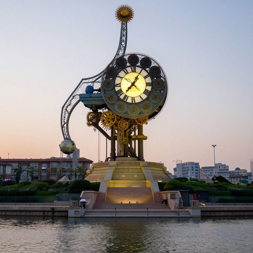 Photograph of a large, futuristic clock sculpture with a golden, sunburst-topped central mechanism, set atop a broad staircase. The clock face is illuminated with a bright yellow glow, surrounded by intricate black metalwork and gears. The sculpture stands beside a calm waterfront, with urban buildings and trees in the background. The sky is a gradient of blue to orange, indicating either sunrise or sunset. The clock's design is whimsical and steampunk-inspired, with a prominent, looping arm on the left side. A small figure is visible at the base of the staircase, adding scale to the massive structure.