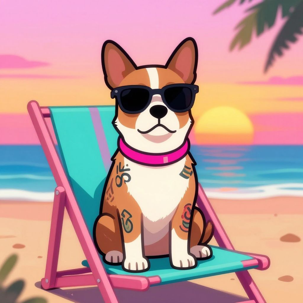 Digital drawing of a cute, cartoon-style corgi with brown and white fur, wearing black sunglasses and a pink collar. The corgi sits on a pink beach chair with a turquoise seat, positioned on a sandy beach. The background features a vibrant sunset with pink, orange, and yellow hues, and a calm ocean with gentle waves. A palm tree is partially visible on the right. The corgi's face is smiling, and it has small, white tattoos on its brown fur. The overall style is colorful and playful, with smooth, bold lines.