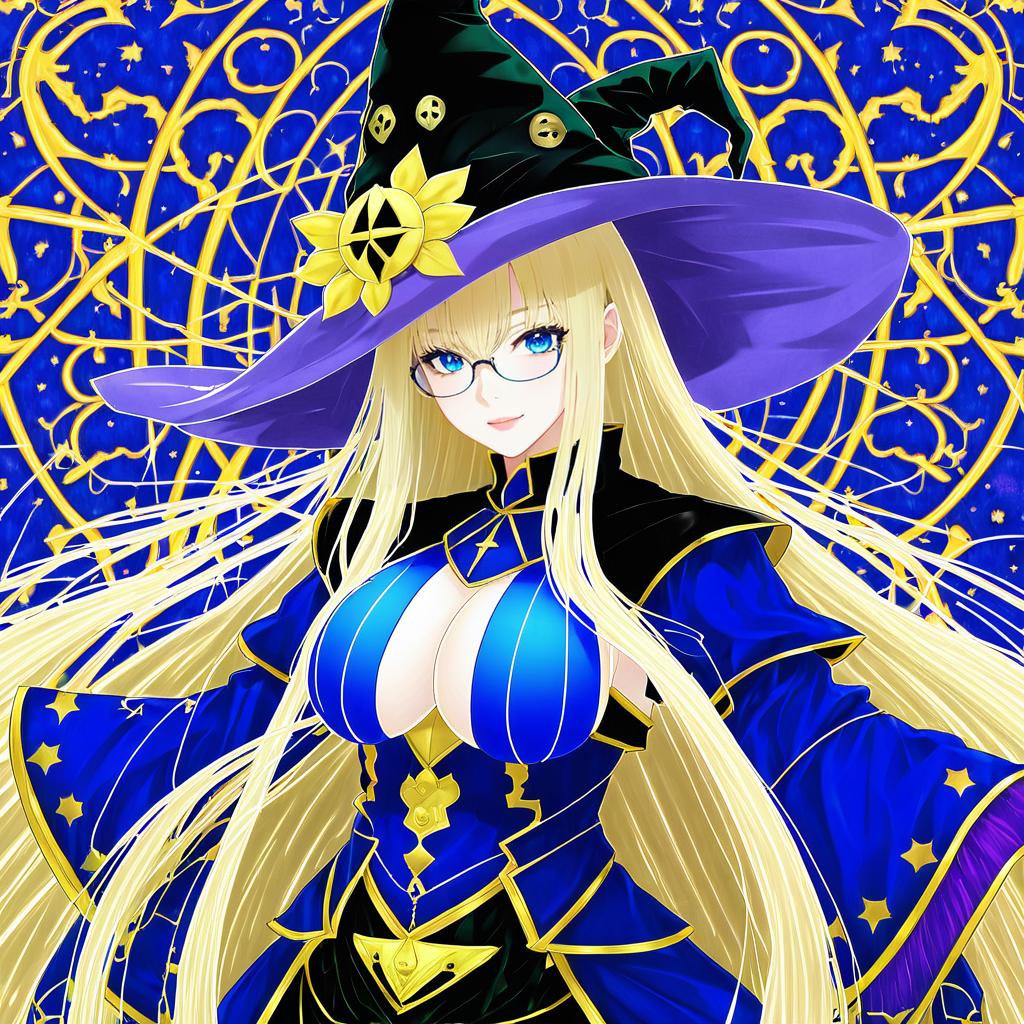 Aesc (fate), fate/grand order, 1girl, blue eyes, glasses, blonde hair, long hair, very long hair, large breasts, witch hat, long sleeves, by artist tsukumo (soar99), anime