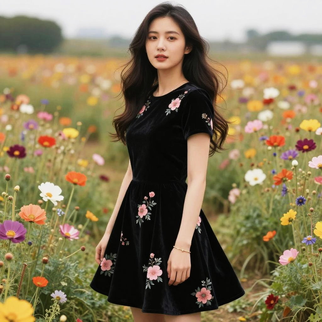 Photograph of an Asian woman with long, wavy black hair standing in a vibrant, colorful flower field. She wears a short-sleeved, black velvet dress adorned with pink and white floral patterns. Her expression is neutral, and she gazes slightly to the side. The background is a blurred expanse of greenery and a variety of blooming flowers in red, yellow, pink, and purple. The overcast sky adds a soft, diffused light to the scene. The woman's skin tone is light, and she wears a simple gold bracelet on her left wrist. The overall mood is serene and natural.