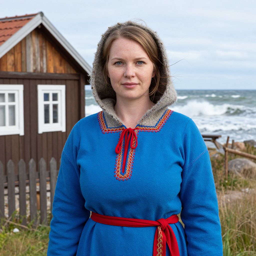 A vivid outdoor shot of a Baltic-born woman with light brown skin, freckles, and gentle blue eyes wearing a Livonian-inspired costume with a bright blue dress, red belt, and a woolen hood, standing in front of a traditional wooden house in a coastal village near the Baltic Sea with waves crashing in the background.. The woman has big tits and cute face