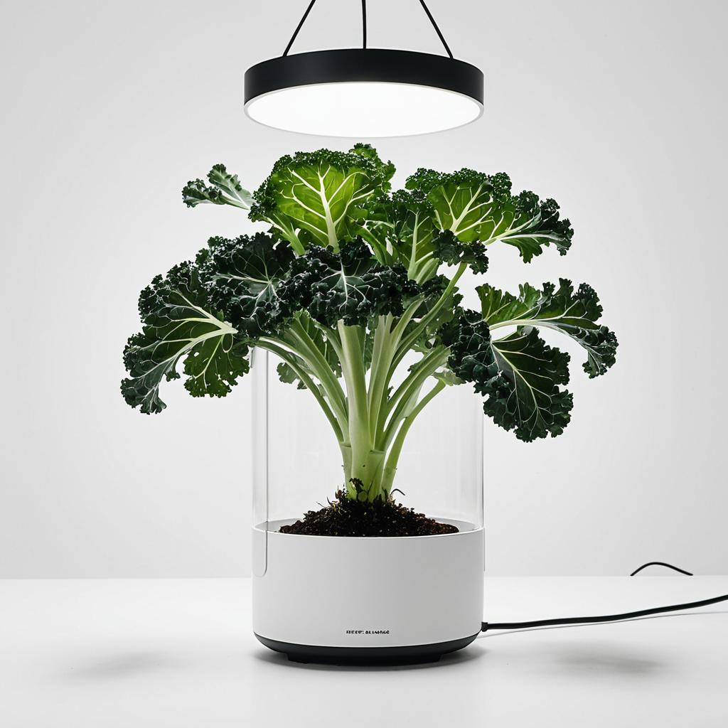 Fresh green kale growing hydroponically in a sleek, modern white planter with a transparent plastic shell. The setup features a minimalist design with a circular LED grow light suspended above, creating a clean, high-detail image on a white background with studio lighting.