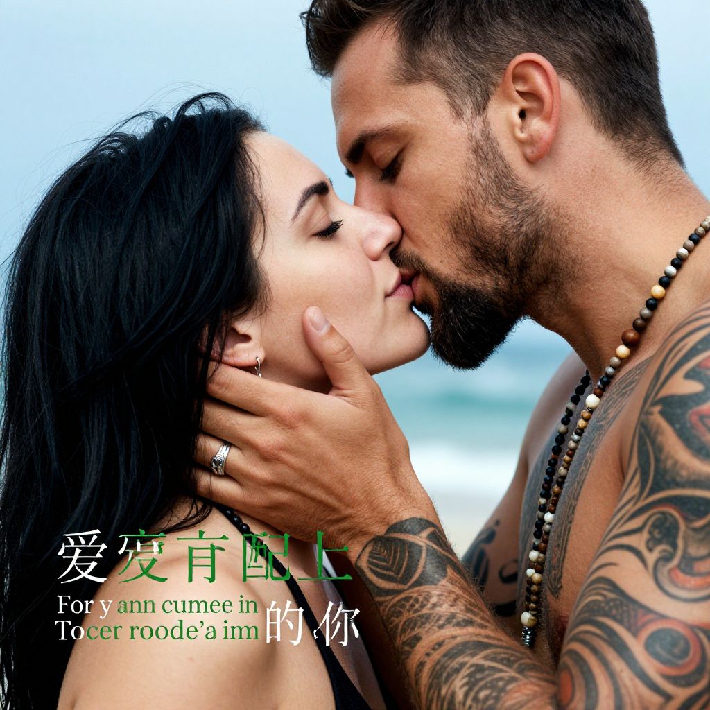 Photograph of a close-up kiss between a tattooed man with a beard and a woman with long dark hair. The man's right hand gently holds the woman's face. He's wearing a beaded necklace, and she has a silver ring on her finger. The background is blurred and blue. Text in green and white overlays the image, conveying a romantic message.