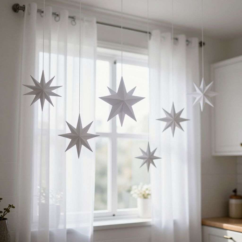 Origami star decorations elegantly hang from sheer white curtains, creating a festive and whimsical ambiance around a kitchen window with natural light streaming through.