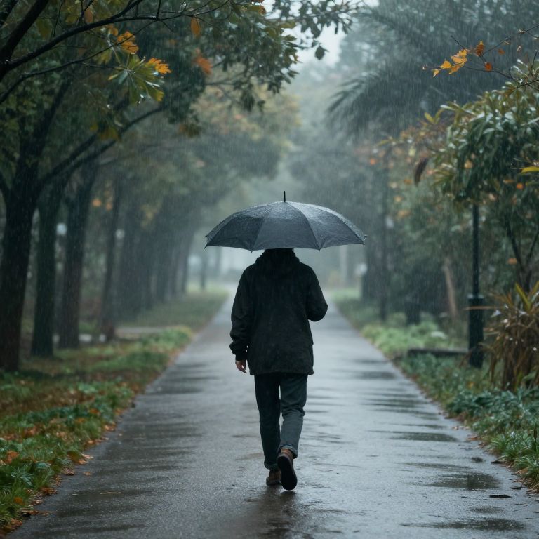 Under the veil of falling rain, a solitary figure walks down a misty path, their umbrella a shield against the world, embodying the quiet solitude of introspection amidst the transient beauty of nature’s embrace.