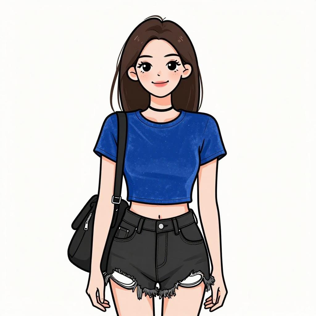 Digital illustration of a smiling young woman with long brown hair, wearing a blue crop top, black high-waisted shorts, and a black choker