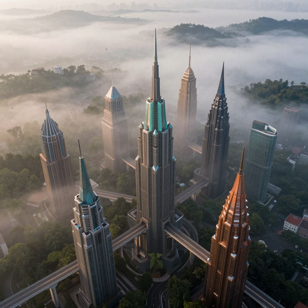 Aerial photograph of Kuala Lumpur's Petronas Twin Towers and surrounding skyscrapers shrouded in morning mist, with green and teal spires
