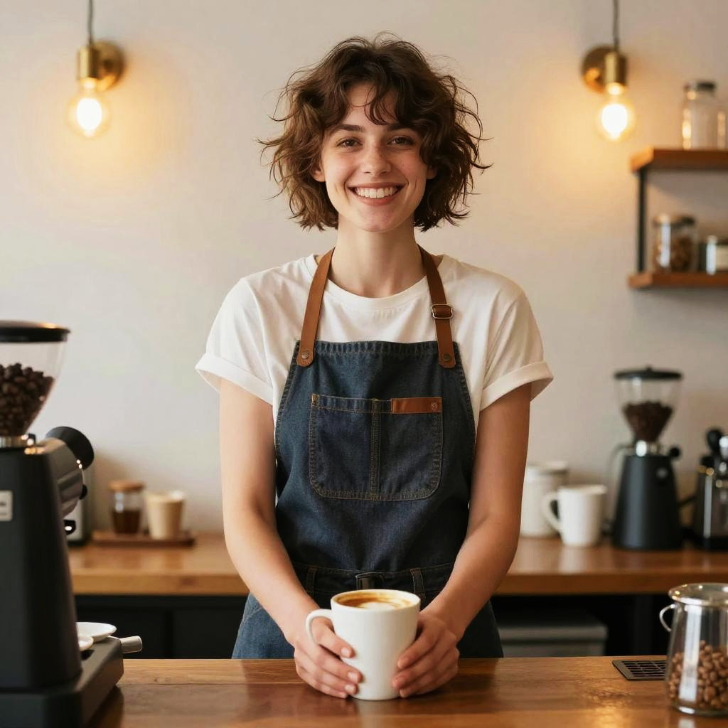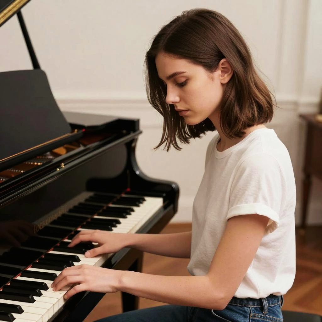 Photo-shoot, thoughtful student studying, long wavy hair, average frame, casual outfit, photo by Sarah Johnson, cozy library setting studio background