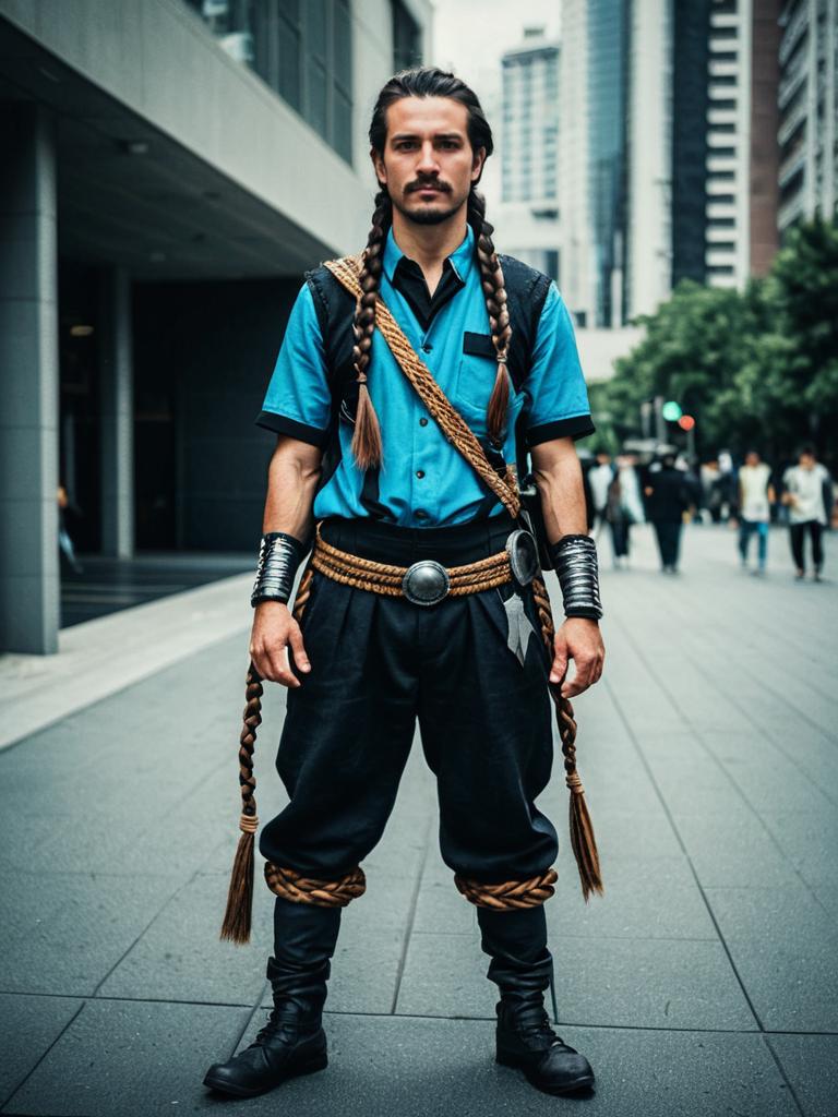 Man in Braided Hairstyle costume, full-body cosplay photo, cinematic realism