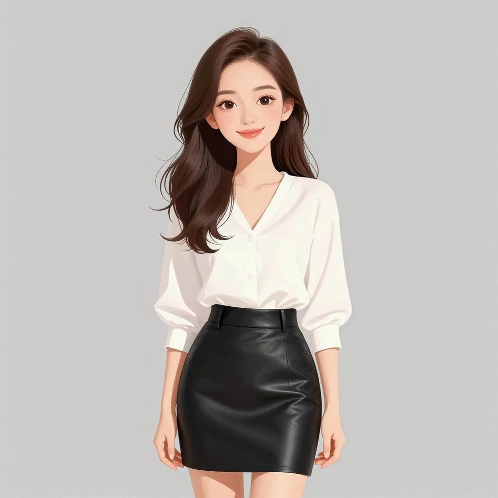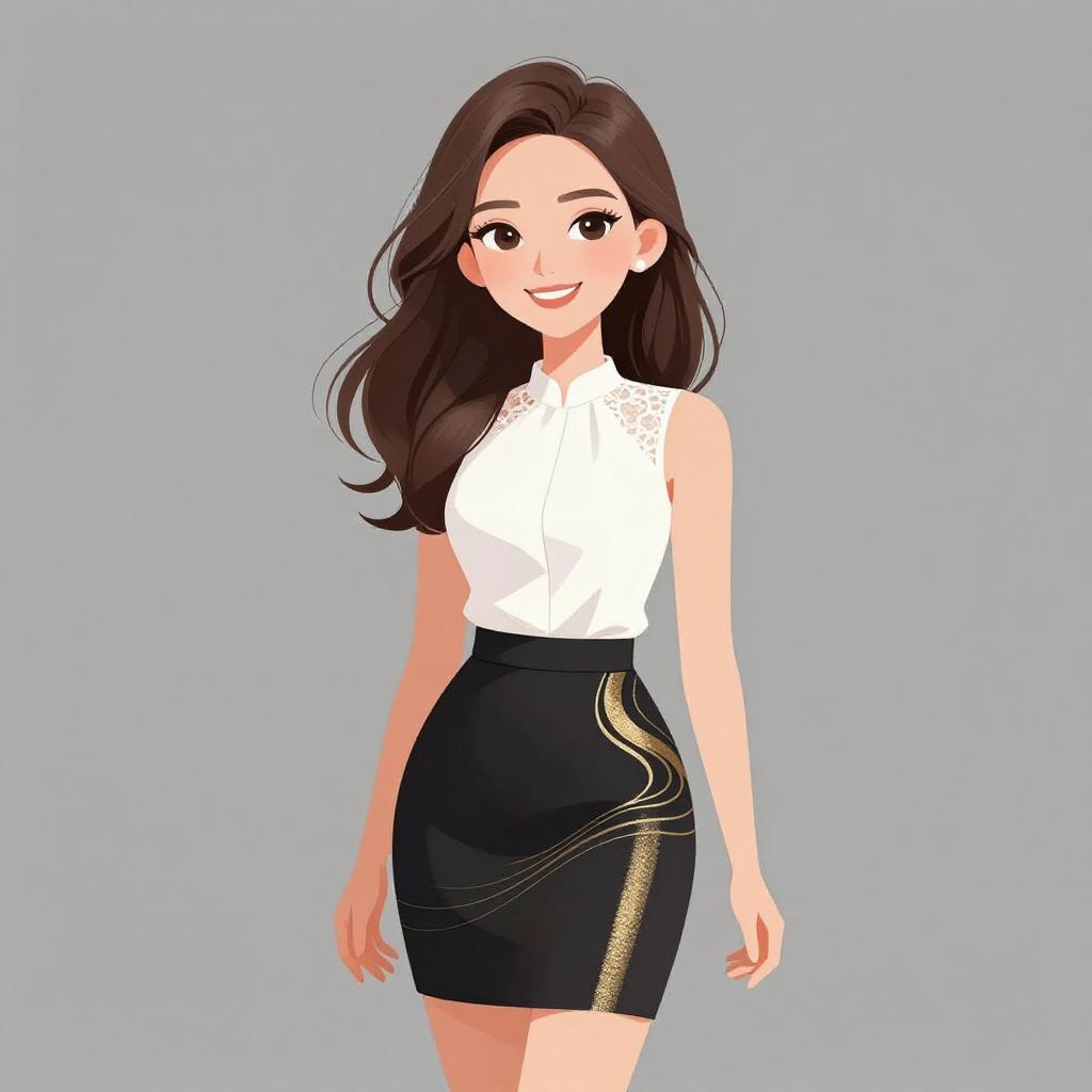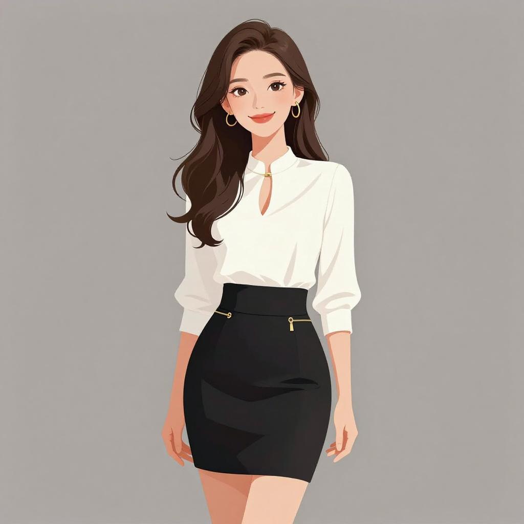 Woman with pretty face and pretty hair. smiling Woman, chic, white blouse with keyhole neckline, three-quarter sleeves, tucked into a high-waisted black mini skirt with gold zipper accents, form-fitting silhouette. --sref 1467