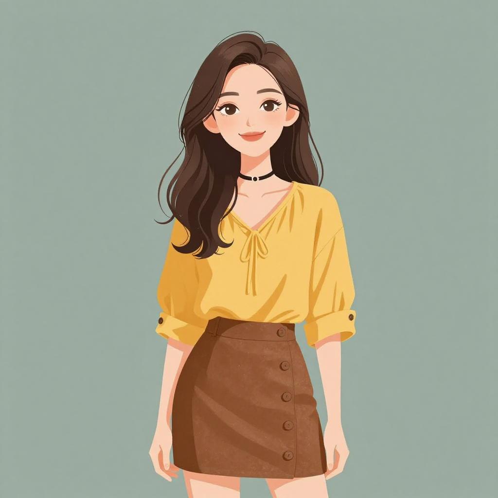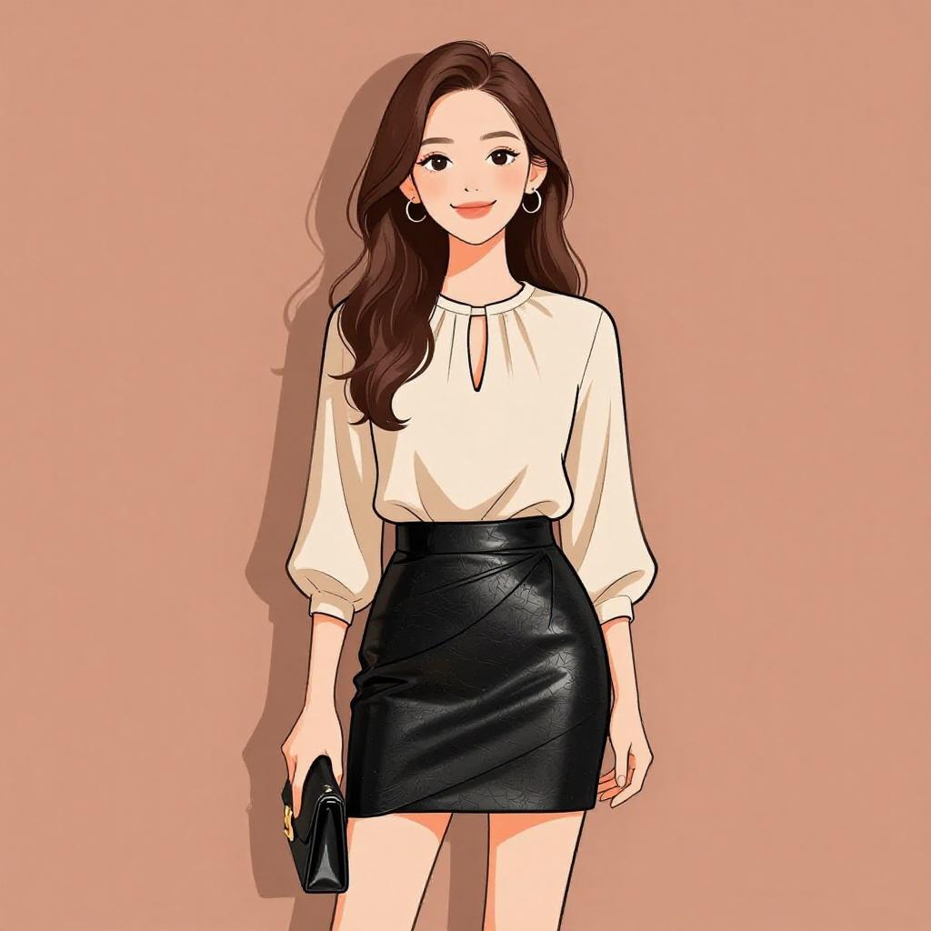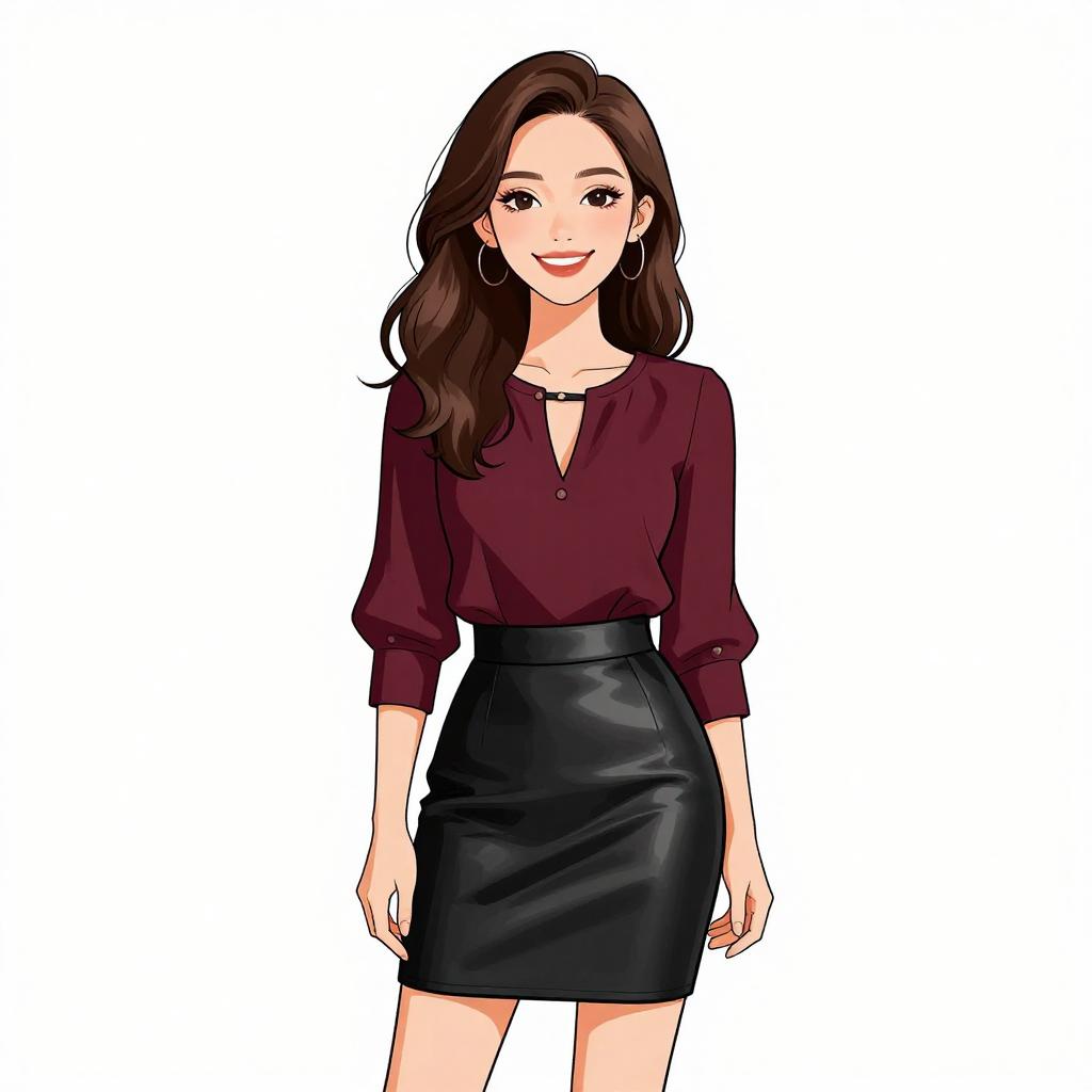 Woman with pretty face and pretty hair. smiling Woman, chic, white blouse with keyhole neckline, three-quarter sleeves, tucked into a high-waisted black mini skirt with gold zipper accents, form-fitting silhouette. --sref 1467