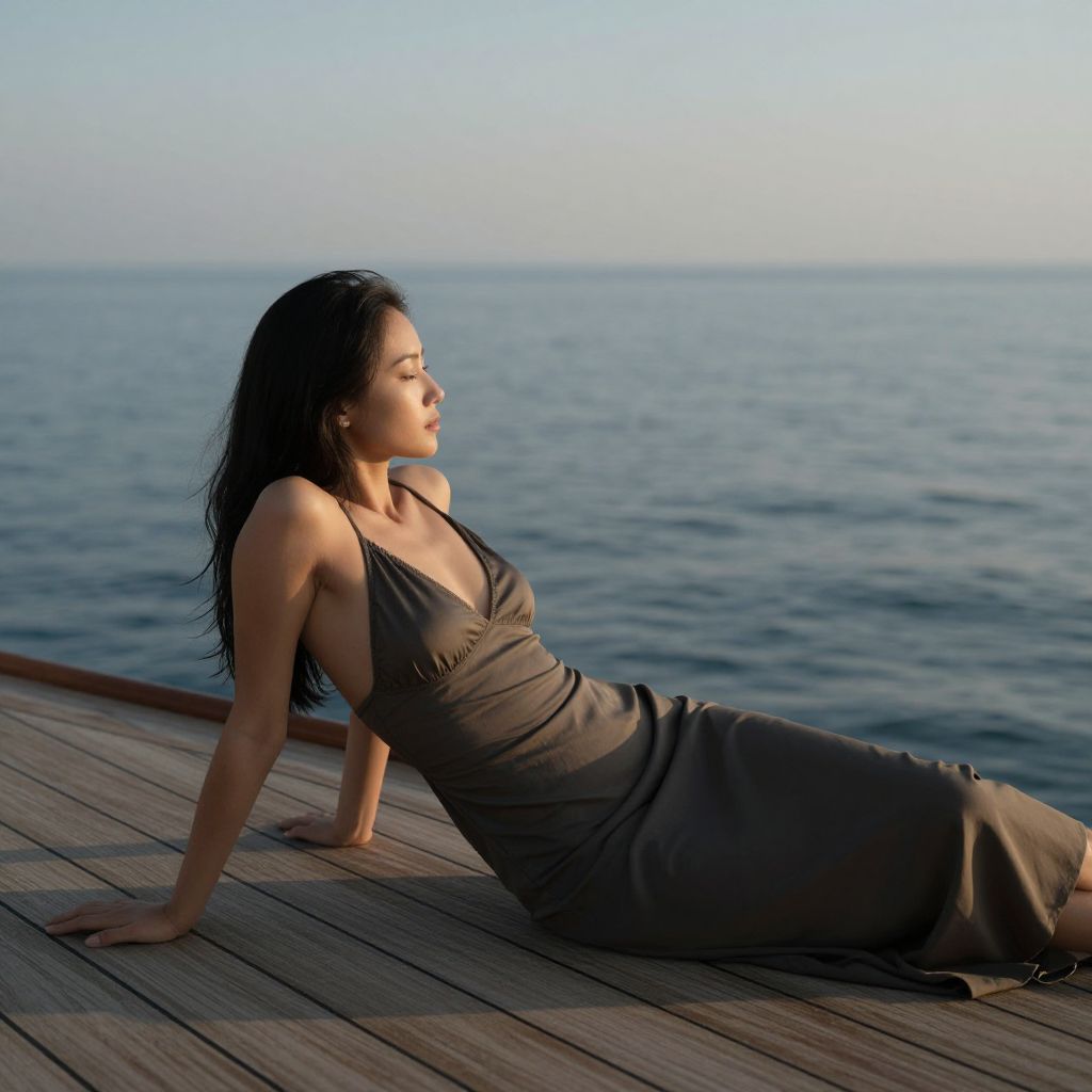 Photograph of an Asian woman with long, wet, black hair, sitting on a wooden deck by a calm, expansive blue sea. She is wearing a sleeveless, dark brown, draped dress with a deep neckline, showcasing a slender, toned physique. She leans back on her arms, gazing to the right with a serene expression. The wooden deck has a natural, weathered texture, and the horizon in the background is faintly visible under a clear, light blue sky. Soft, natural light highlights her silhouette and the gentle waves of the sea.
