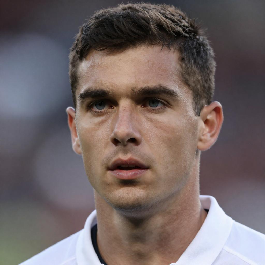 Close-up photograph of a man with fair skin and blue eyes, wearing a red uniform, holding a ring with a green enameled surface and a black emblem. Blurred background. Intense focus on ring and face. Man's face slightly out of focus. One hand visible.