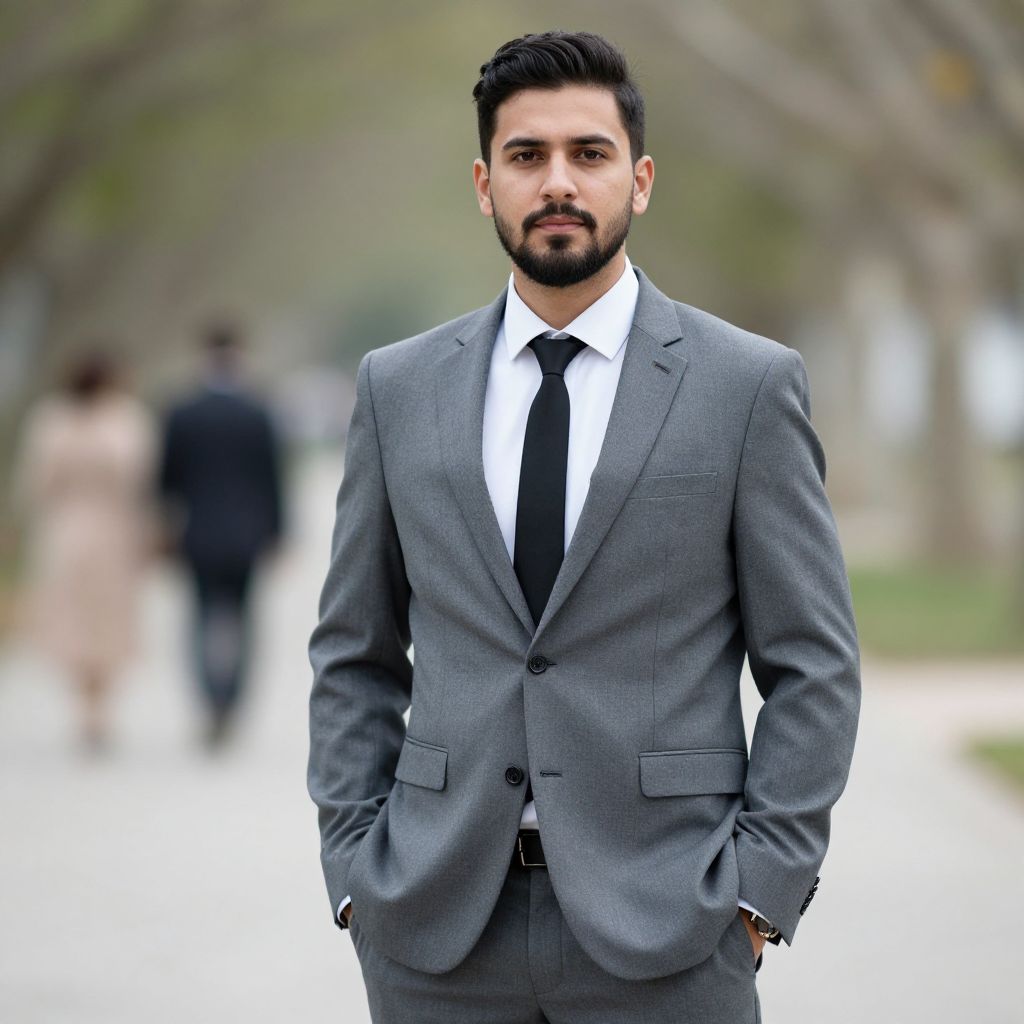 Spring wedding groom attire, 1boy, male focus, solo, facial hair, necktie, blurry background, suit, formal, shirt, blurry, outdoors, hands in pockets, pants, jacket, beard, grey jacket, black hair, looking at viewer, mustache, collared shirt, white shirt, standing, black necktie