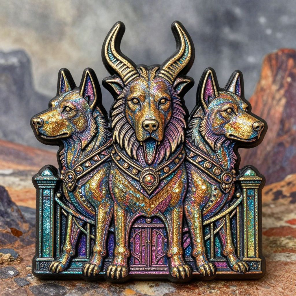 Line art trinket depicting a Cerberus - A monstrous three-headed dog that guards the gates of the underworld in Greek mythology. Lillian Bassman, natural, shimmering, vibrant, gothic, rpg, 1400ad, ultra detailed, detailed, immersive, reminiscent of high fantasy RPG games, HD, masterpiece, best quality, hyper detailed, super realistic, perfect face, perfect hands, award-winning, professional, breathtaking, linquiveradreary Desertdisturbed weatherwatercolor painting . vibrant, beautiful, painterly, textural