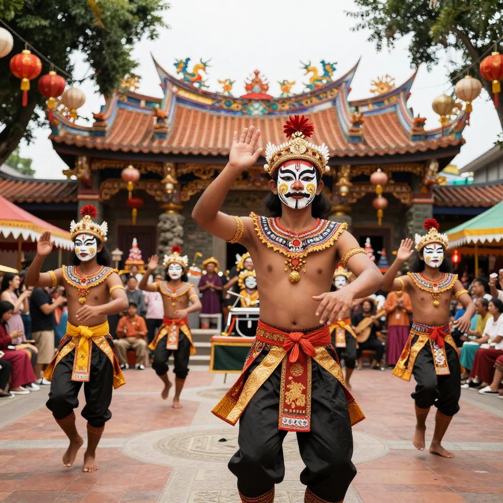 Malasia traditional cultural festival, dancers in colorful costumes performing in front of historic temples, intricate face paint and accessories, festive mood with lanterns and decorative banners, lively crowd enjoying music and celebrations, vivid colors and details