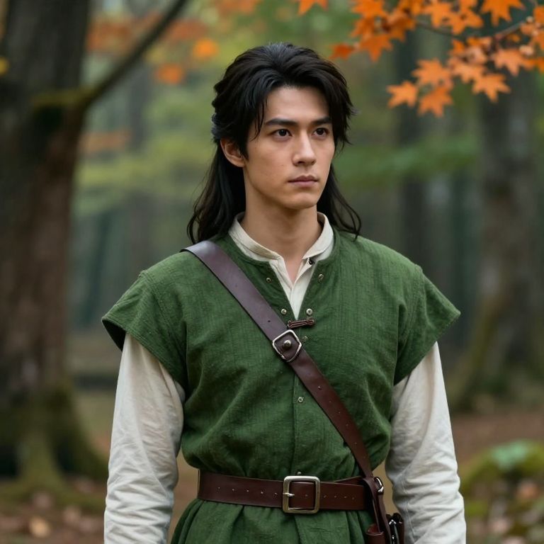 The image depicts a character with long, dark hair styled in a ponytail, wearing a green tunic with a brown leather belt and a white shirt underneath. The character's expression is serious and contemplative. The background features a forest with green and orange leaves, suggesting a fall setting. The lighting is soft, casting gentle shadows and highlighting the character's features. The overall composition is balanced, with the character centrally positioned and the forest providing a natural, serene backdrop. The image has a fantasy theme, with elements that evoke a medieval or fantasy world.