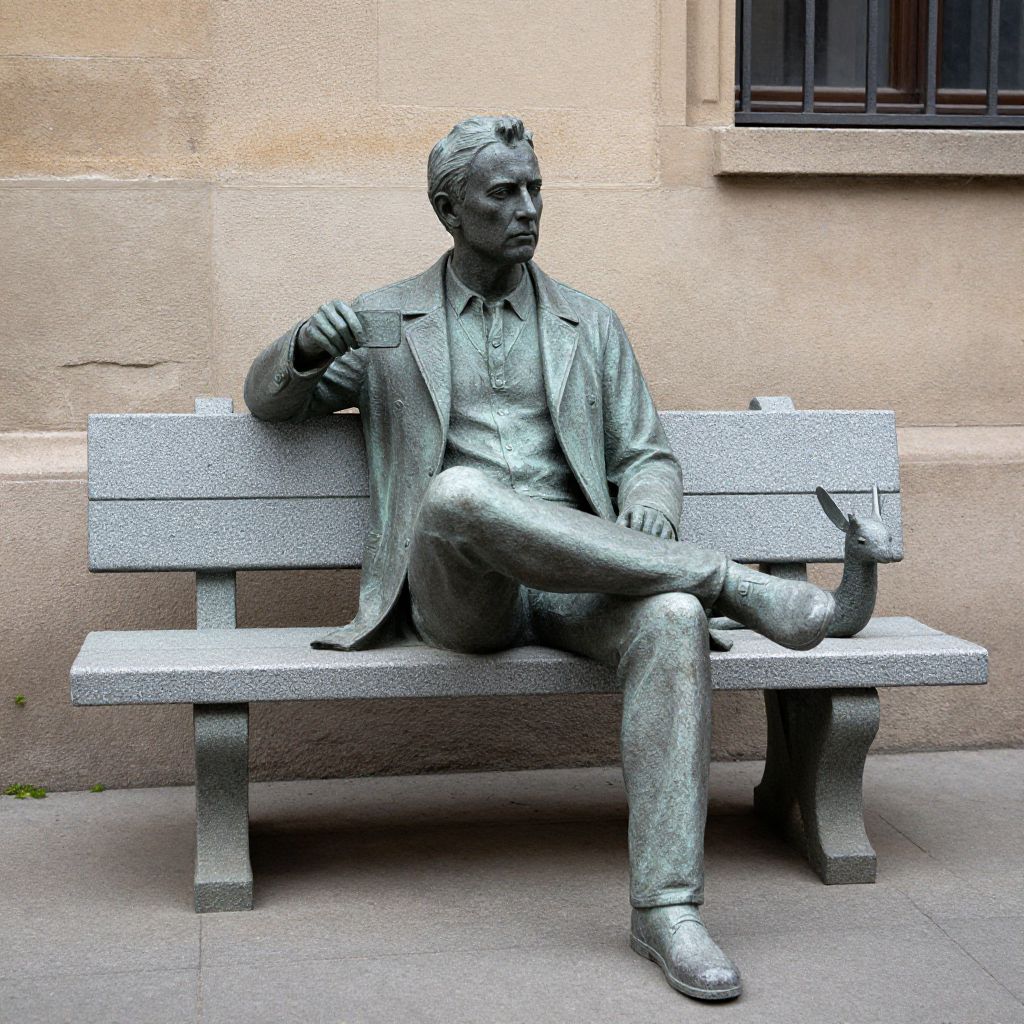 Photograph of a life-sized bronze statue of a seated man with short hair, wearing a suit, shirt, and tie, positioned on a gray, textured stone bench. His right arm rests on the back of the bench, and his left leg is crossed over his right knee, with his left hand holding an oversized, stylized pen. The background features a beige, stone building with a window barred by black metal. The statue's metallic sheen contrasts with the muted, textured surroundings, emphasizing its detailed, realistic features. The bench and pavement are made of the same gray stone material.