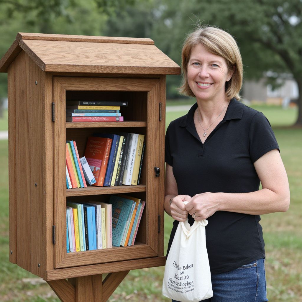 Woman stands beside a wooden Little Free Library filled with colorful books, smiling while holding a white bag, commemorating Christine Rohret and Mary Mascher's father in Iowa.