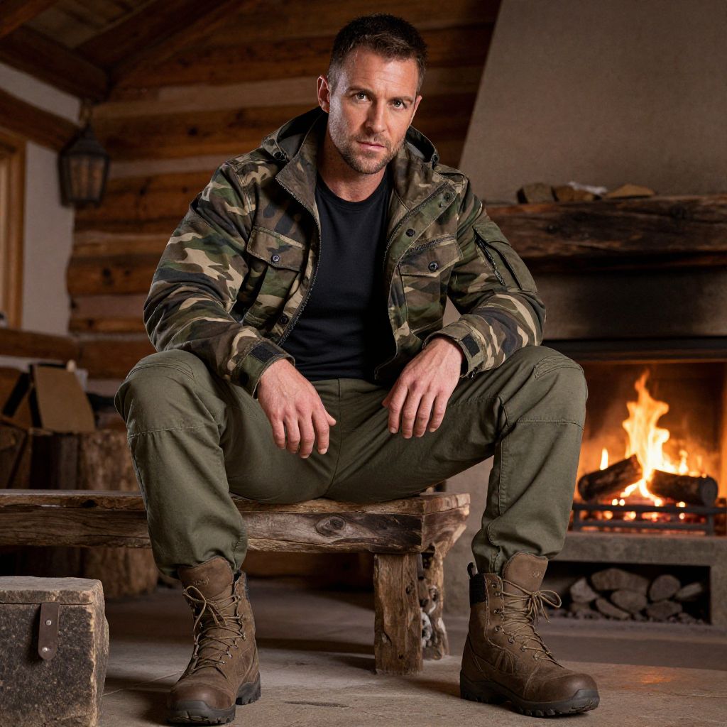 A man, relaxed-fit cargo pants, utility jacket, fitted gray henley shirt, black combat boots, rustic log cabin, surrounded by pine trees, crackling fireplace, medium format film, contemplative expression. Man has masculine face and piercing eyes